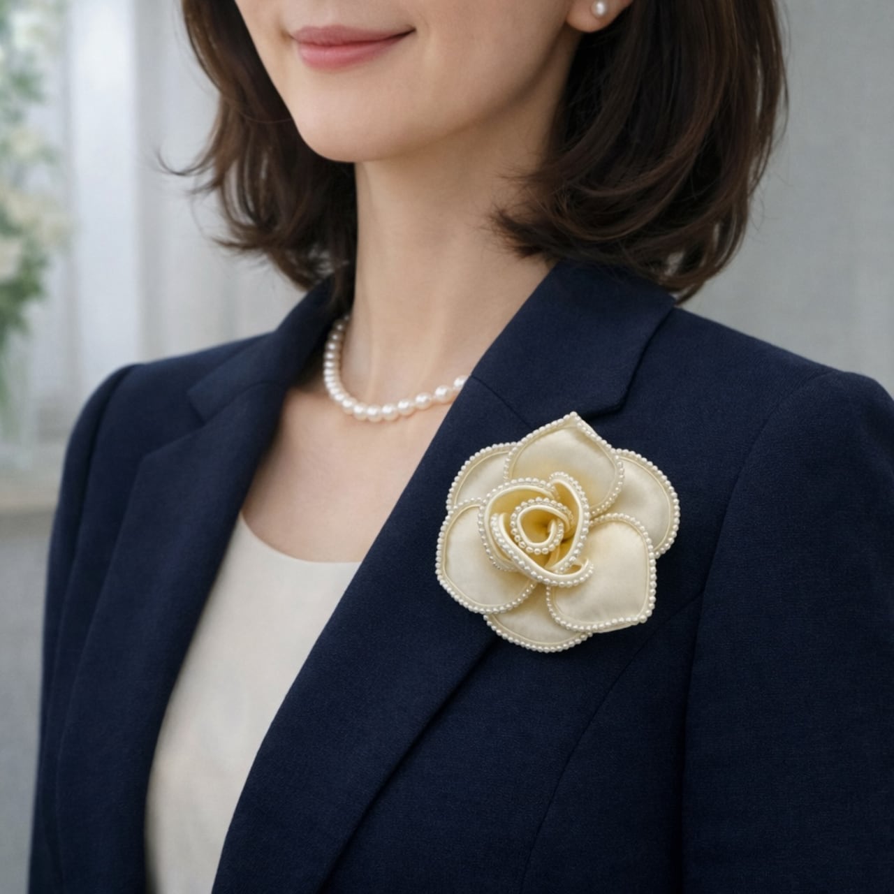 上品さと存在感を兼ね備えたカメリアデザインが特徴のアイテムです。華やかなパールの輝きが、特別な日の装いを引き立てるエレガントな雰囲気を演出します。結婚式や卒業式、あらゆるパーティーシーンにふさわしく、シンプルなコーディネートにも華やかさを与えます。